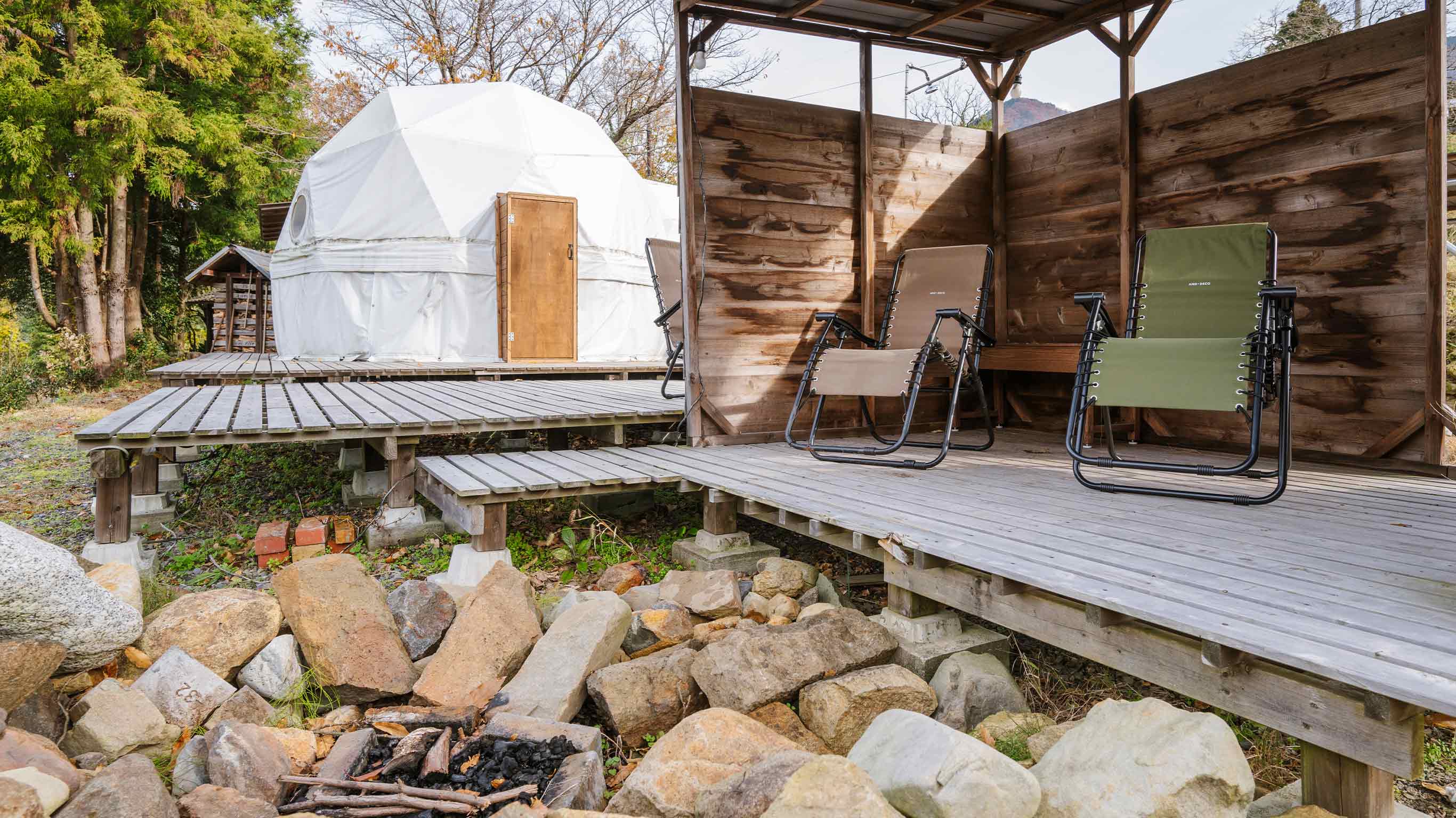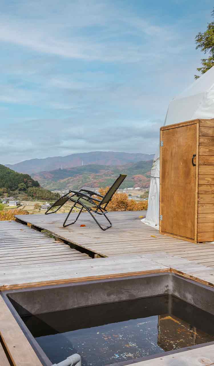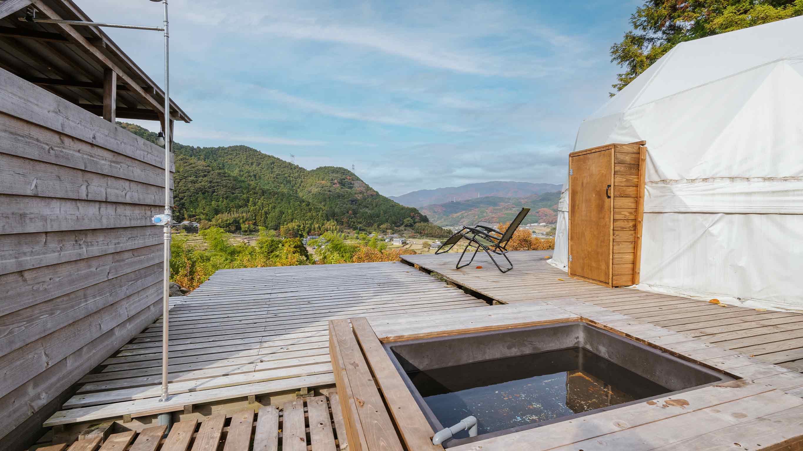 サウナの醍醐味は外気浴。里山を見下ろすウッドデッキで、最高の解放感と爽快感を味わって。